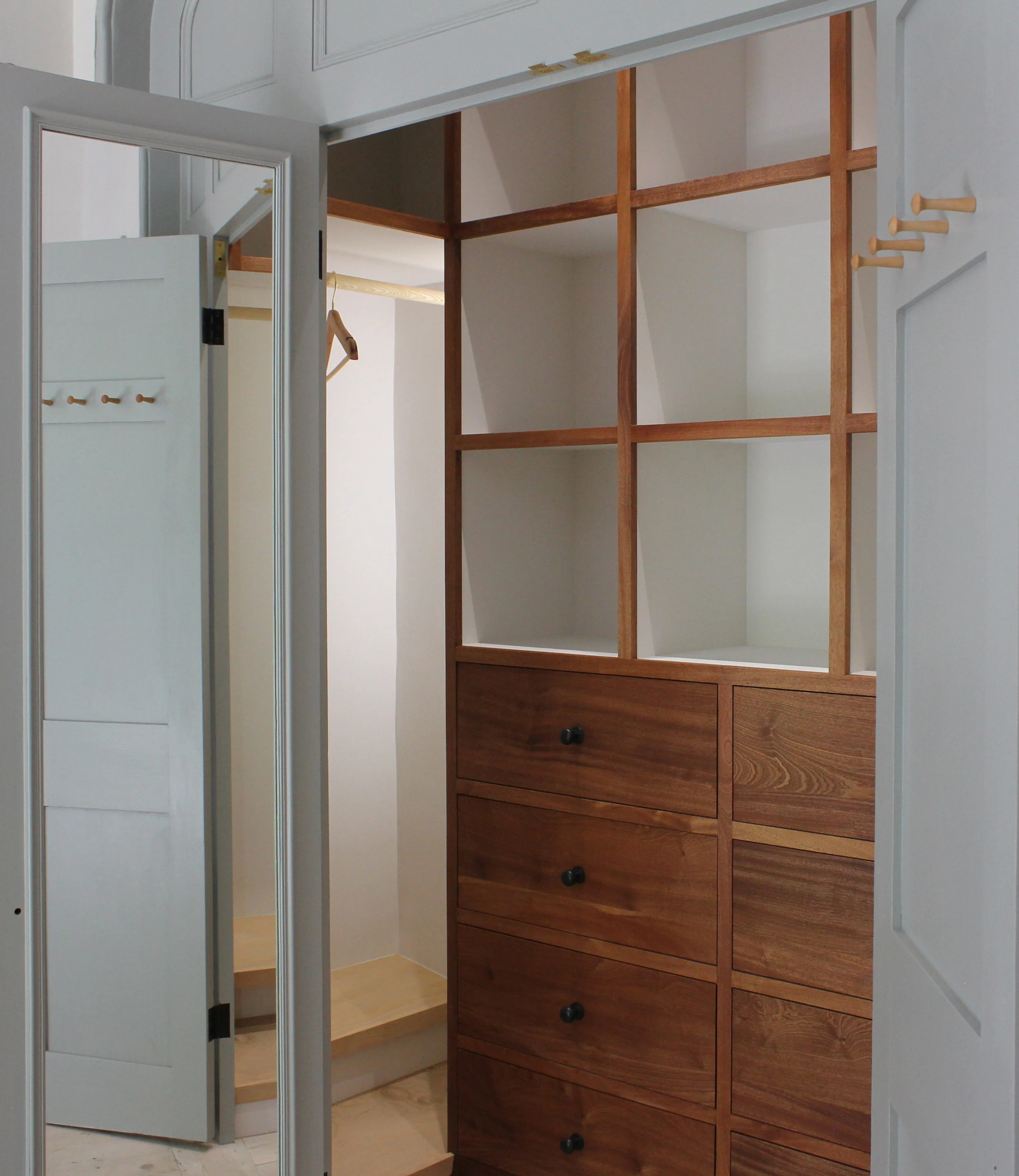 Reworking of a dressing room in a grand early Georgian house in Brixton, South London. The design brief was to make better use of a rather strange arched niche which seemed to have at one point been an entrance to another part of the house. We took cues from the original woodwork to create a panelled wall with a walk-in wardrobe beyond. The separation of the spaces allowed for a more modern interior.