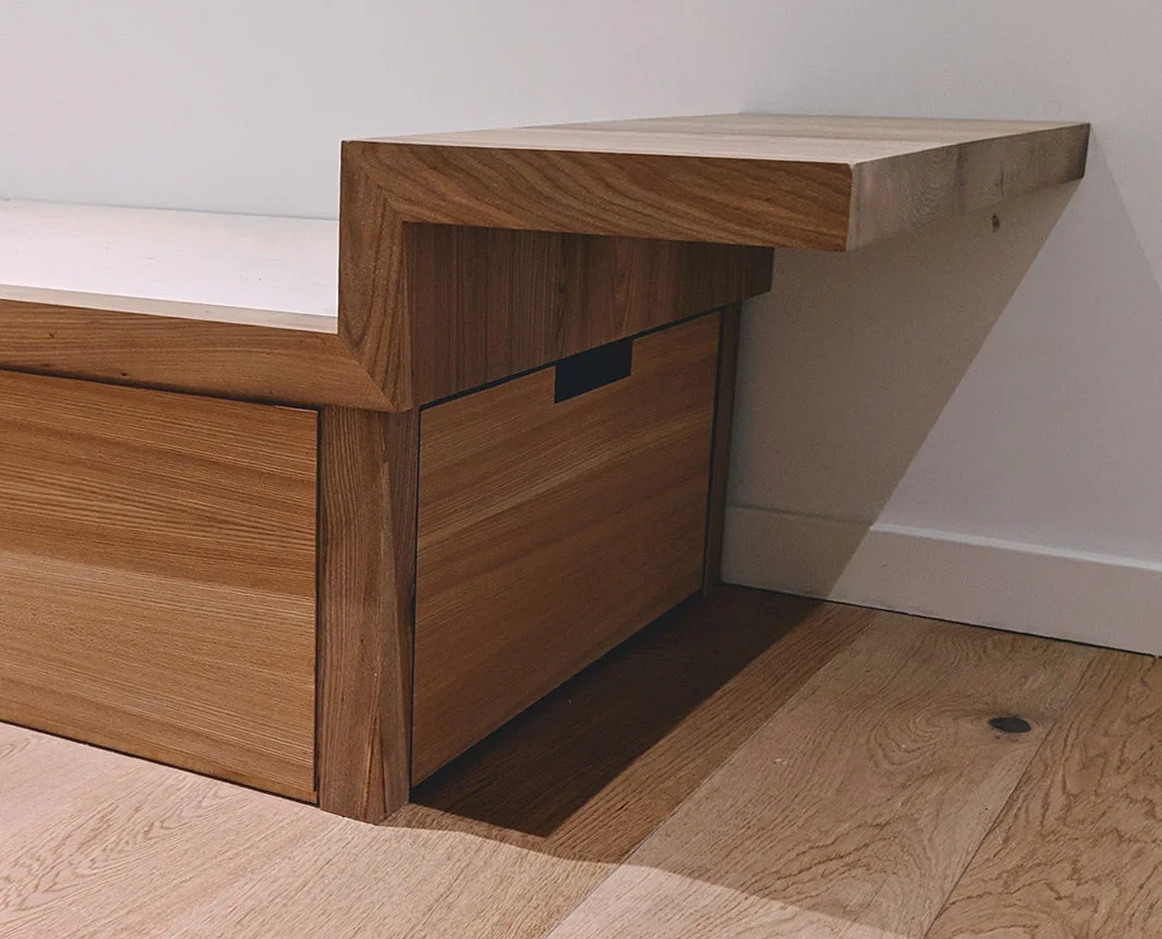 The design goal was to use all the available space without bulky vertical boxes. Part of the cabinetry detaches to allow access to the top-loading washing machine hidden in the corner. The opposite corner houses a top-loading freezer.