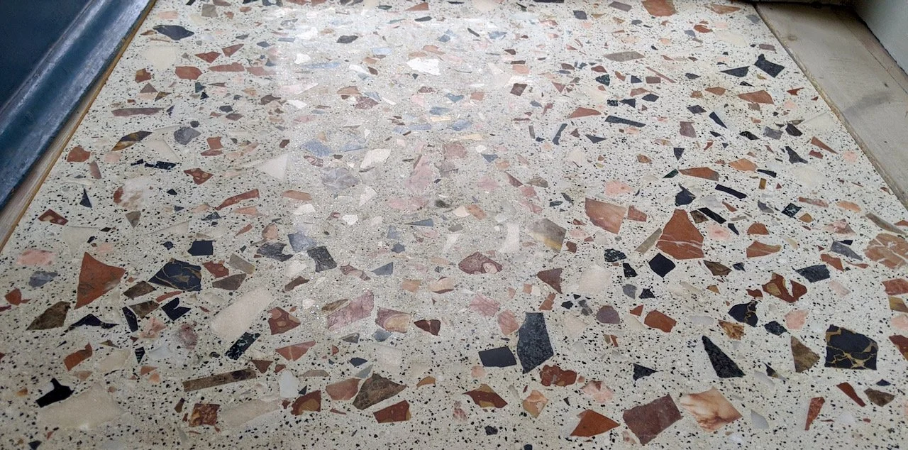 Terrazzo entrance floor panel for a Georgian house in Brixton. The client said the final effect was like “stepping into a box of jewels”