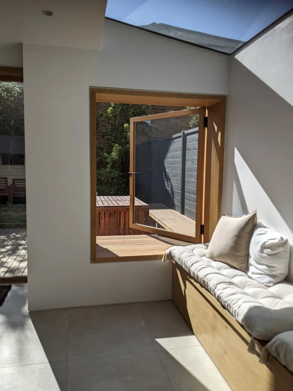 The exterior windows and French doors are in solid oak with matching oak veneered storage benches forming an extended window seat corner.